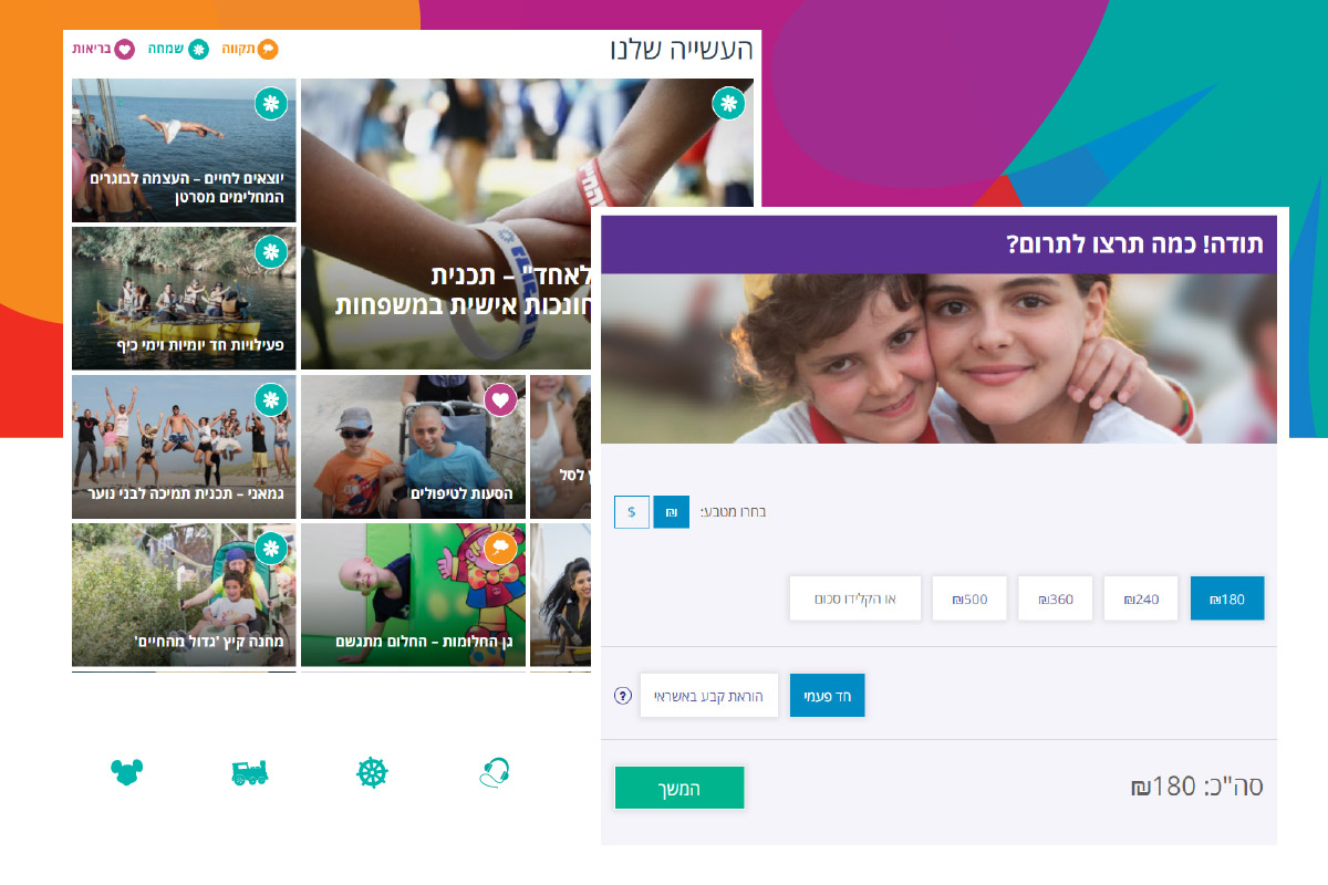 עיצוב ברוח מיתוג העמותה לאתר גיוס תרומות. העמותה הינה ארגון ללא כוונת רווח המסייע לילדים חולי סרטן ולבני משפחותיהם להתמודד עם הפחדים והטיפולים הכרוכים במחלה. אתר בעברית ואתר לתורמים מחו"ל – בשפה האנגלית .